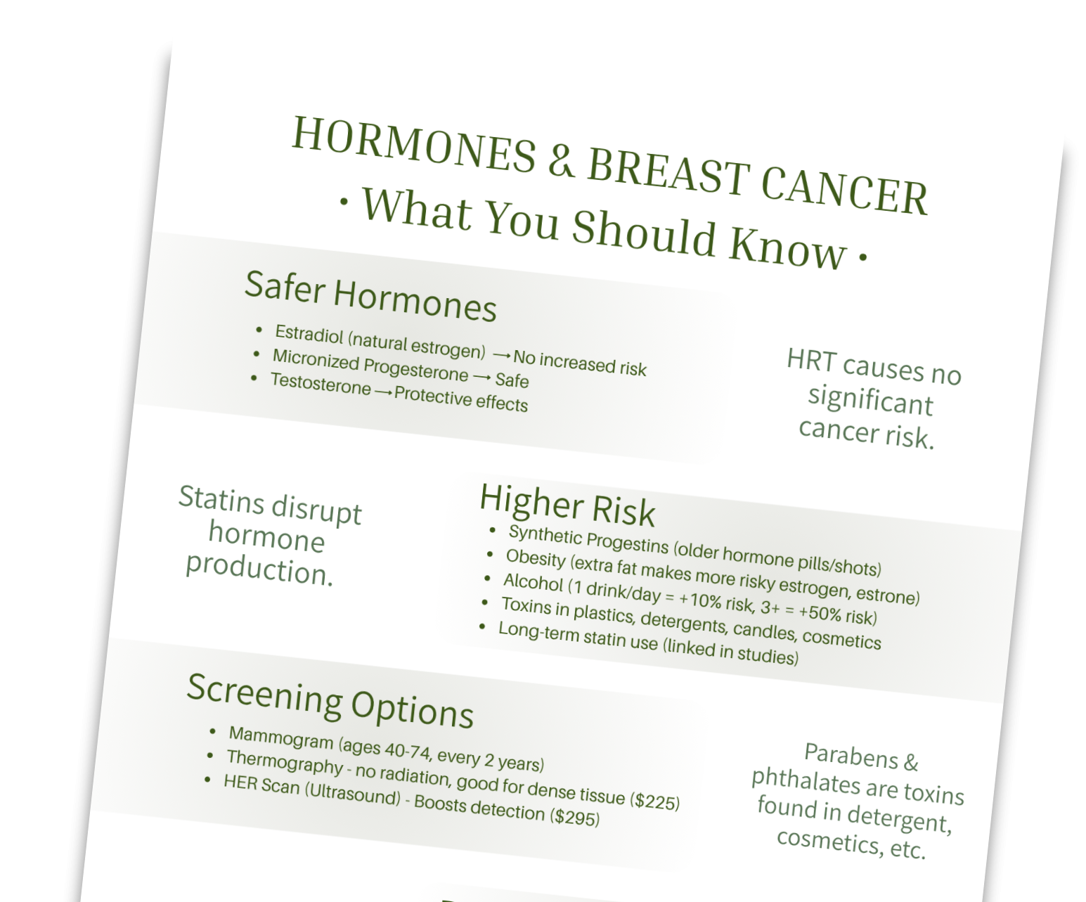 If you’ve ever felt confused about hormones and breast cancer, you’re not alone. After reviewing the research we’ve created a podcast, blog post, and this quick reference. It’s what you should know about hormones and breast cancer and reminders of the risk factors, prevention, and screening options.